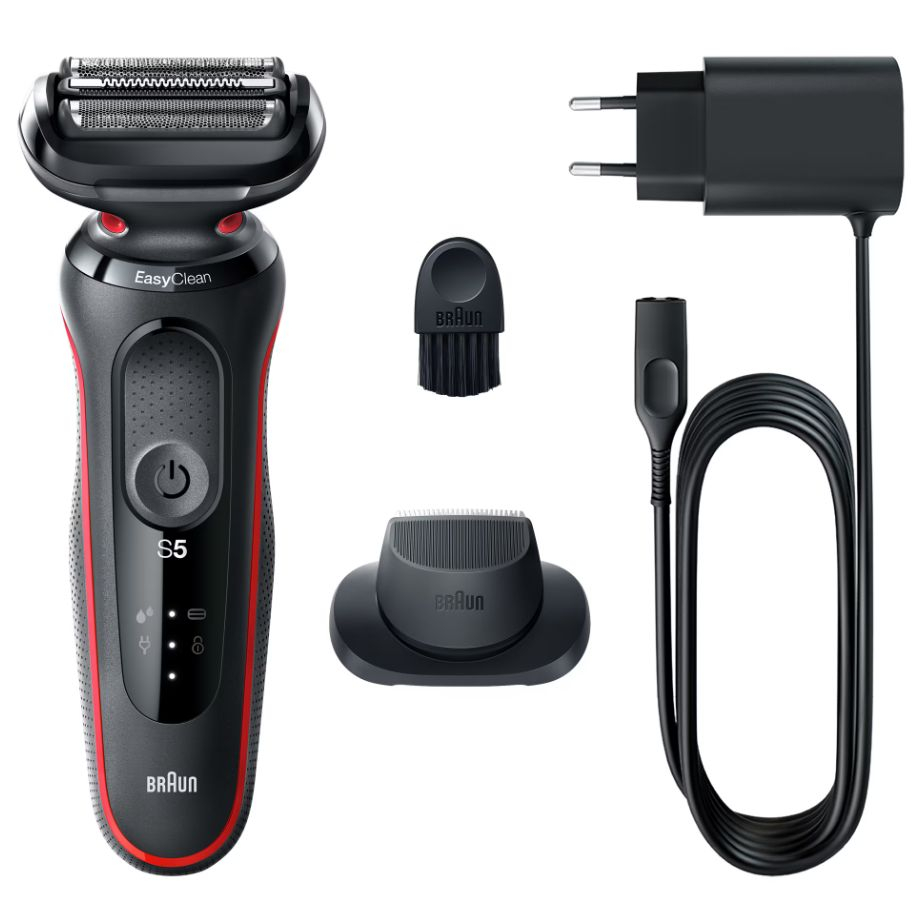 Aparat de ras electric Braun Series 5 51-R1200s Wet&Dry. AutoSense. Easy Clean. Easy Click. 3 elemente de taiere. 1 accesoriu pentru mustata si perciuni. Rosu/Negru