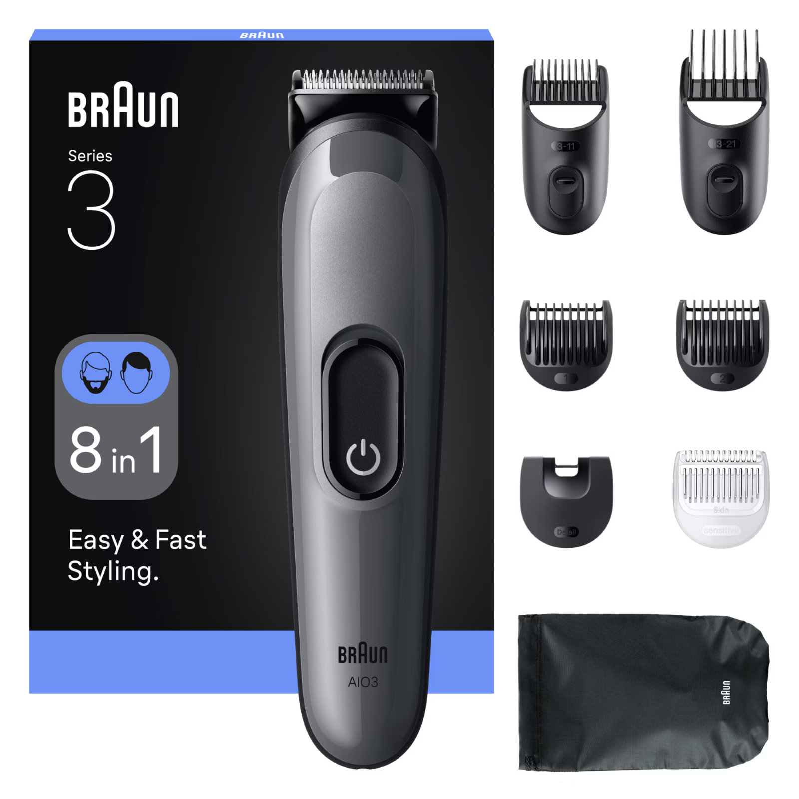 Aparat de tuns multifunctional Braun All-in-One Seria 3 AIO3540, 8-in-1, Lama ultra ascutita, 6 Piepteni, 1 Perie de curatare, 1 Saculet, 14 Setari de lungime , Autonomie 50 minute, Gri argintiu lucio