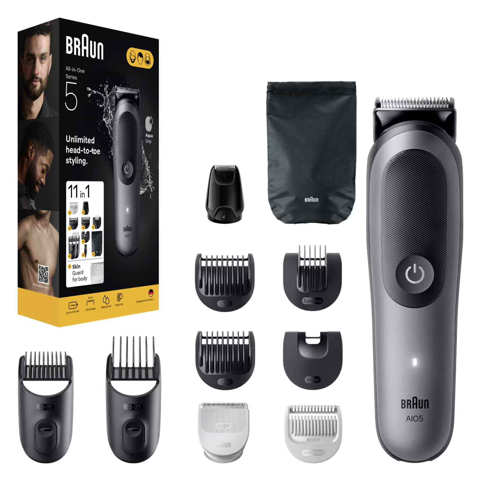 Aparat de tuns multifunctional Braun All-in-One Seria 5 AIO5560, 11-in-1, Lama ultra ascutita, 7 Piepteni, 1 Mini Cap de ras, 1 Cap tuns SkinGuard, 1 Perie de curatare, 1 Saculet, AquaGrip pentru cont