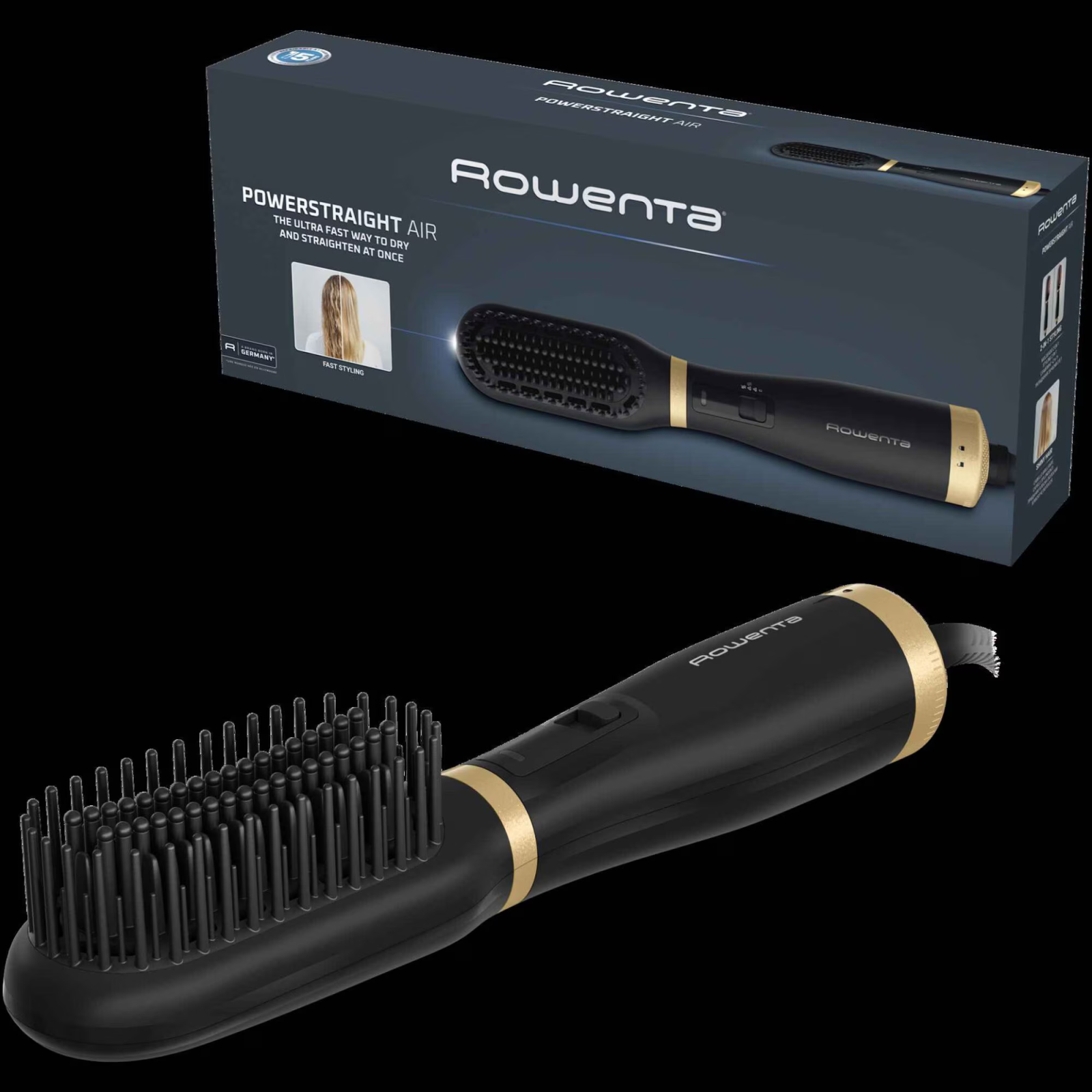 Perie de uscat si indreptat parul cu aer cald 2 in 1 Rowenta Powerstraight Air UB5920F0, 500W, 3 trepte de caldura/aer, invelis ceramic, generare ioni, negru & auriu