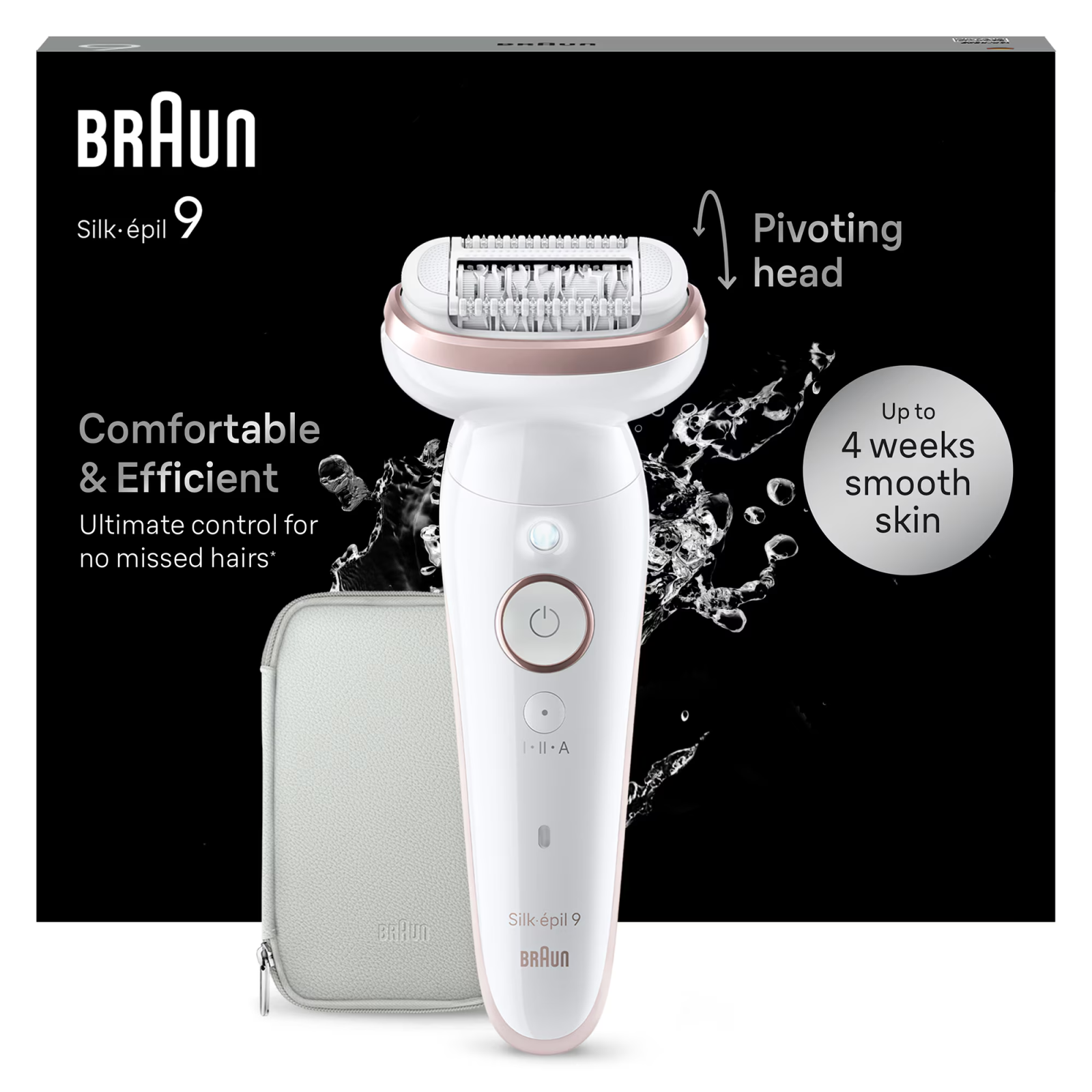 Epilator Braun Silk-épil 9 9-000 Wet & Dry, MicroGrip, Smart Light, 2 viteze, 40 pensete, Geanta de voiaj, Alb/Roz