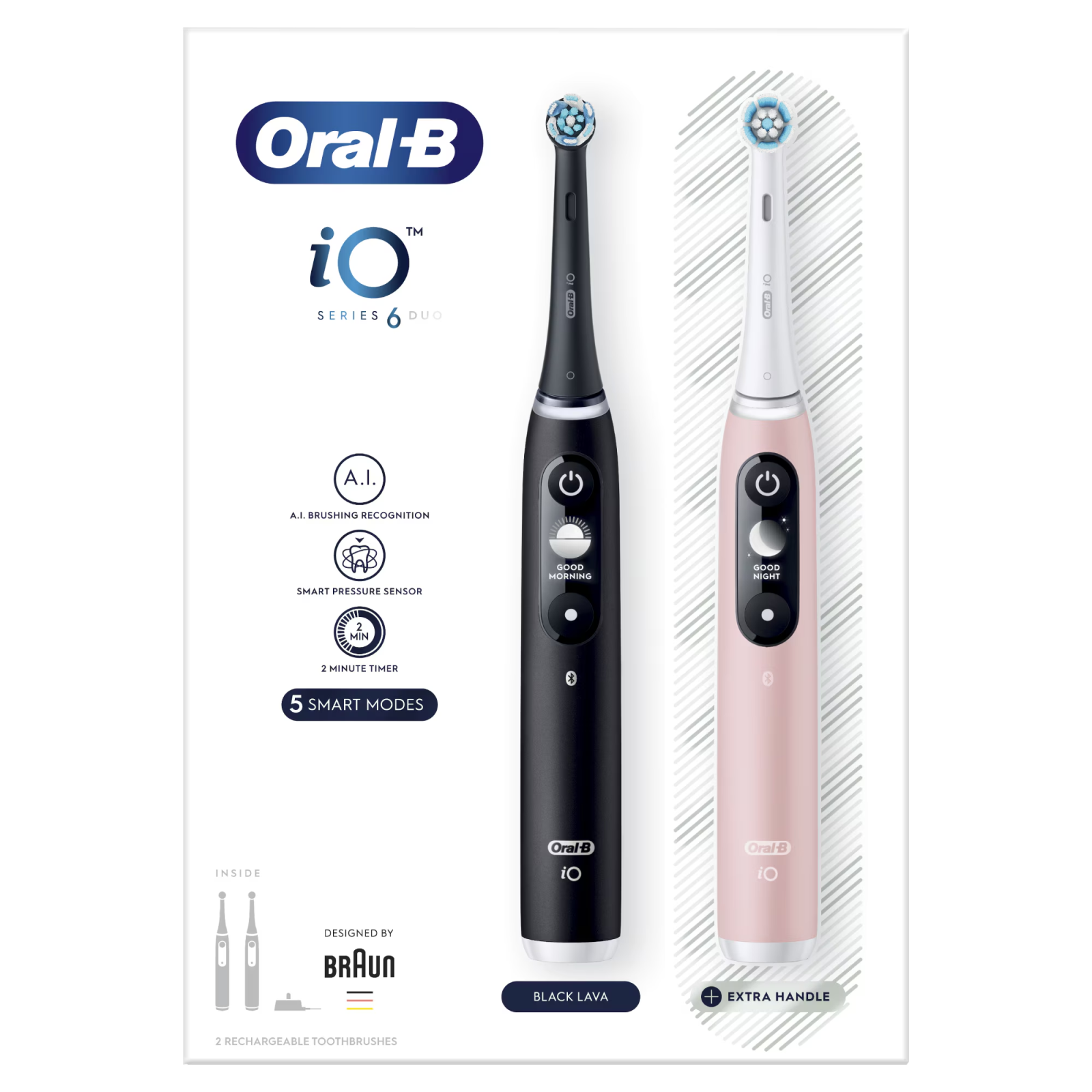 Set 2 x Periuta de dinti electrica Oral-B iO6, cu Tehnologie Magnetica si Micro-Vibratii, Inteligenta artificiala, Display led interactiv, Senzor de presiune Smart, Timer vizibil, 5 moduri, 1 capat, N